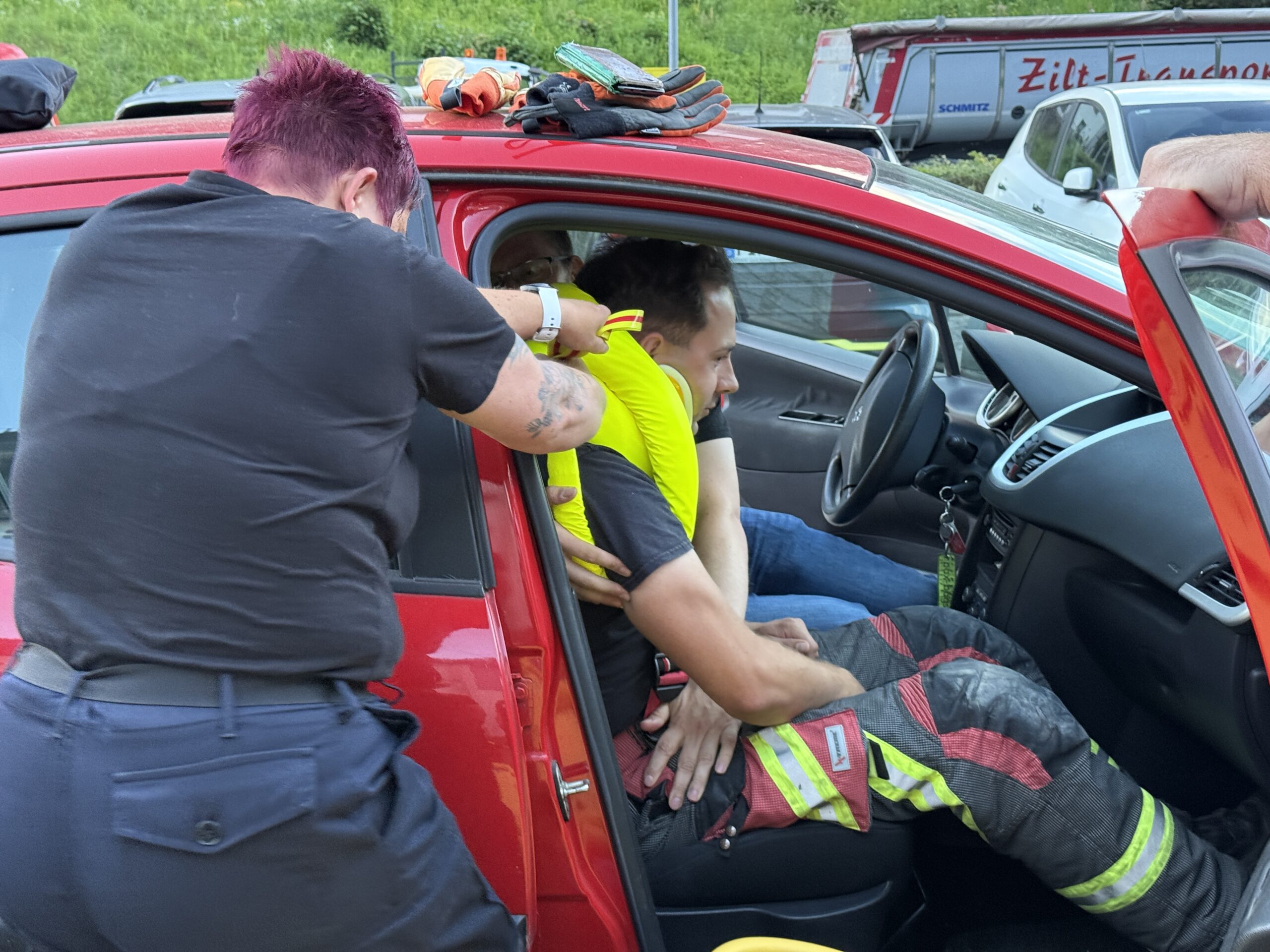 Parallel wurde das Retten einer Person aus einem Fahrzeug geübt. Dazu hatten wir tatkräftige Unterstützung von zwei Mitarbeitern des @drkkreisverbandpirna, welche uns wichtige Handgriffe und patientenschonende Maßnahmen zur Rettung zeigten.