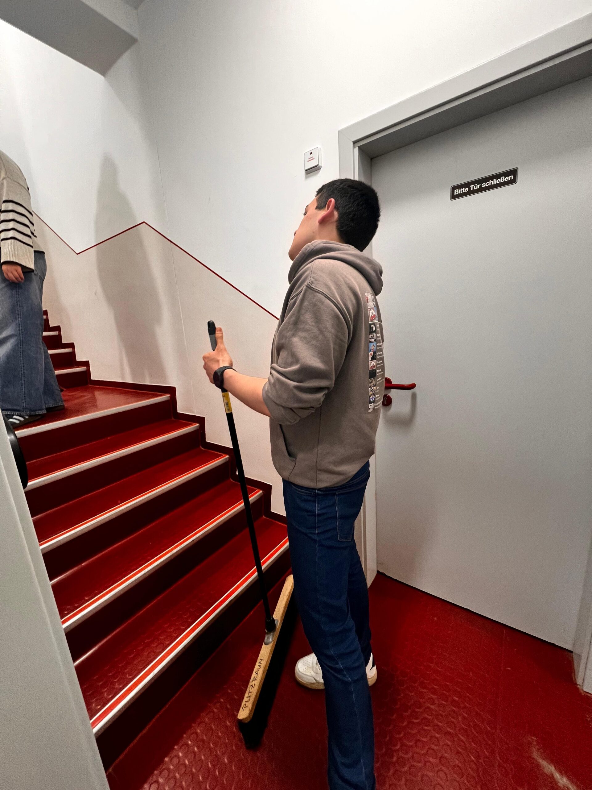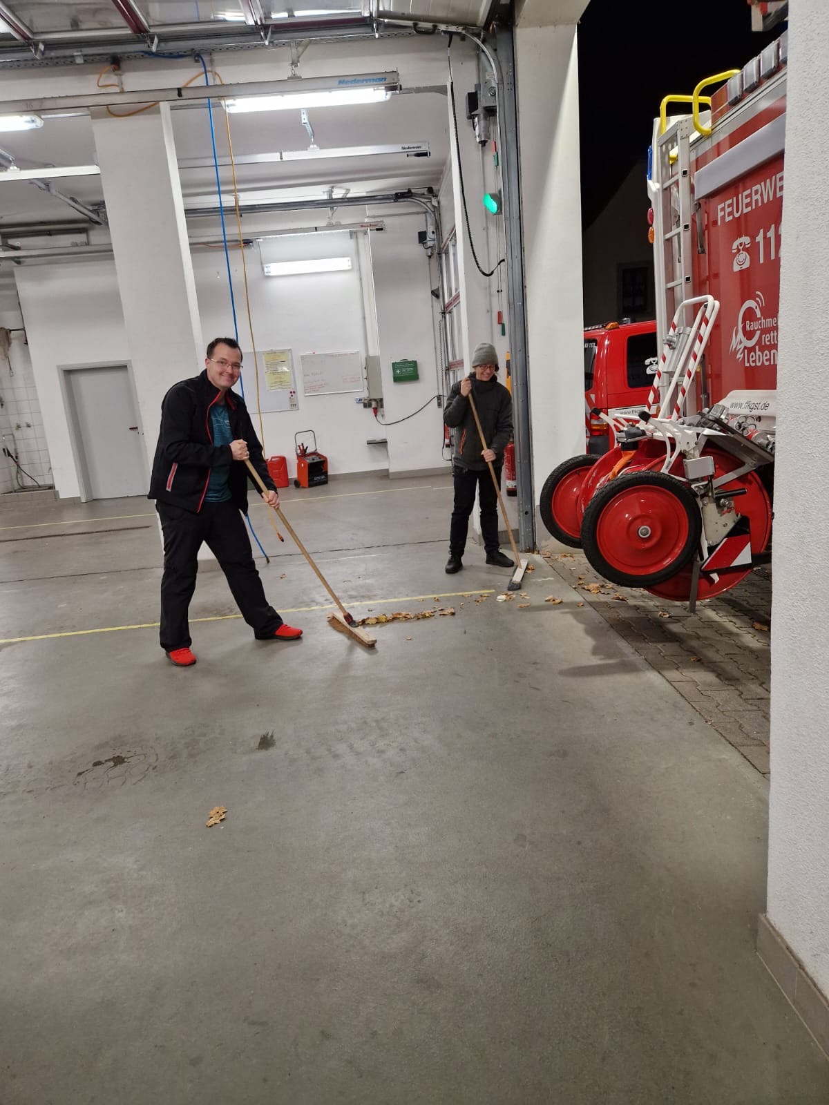 Dazu nahmen wir uns verschiedene Bereiche zum Putzen vor. Vor allem der Boden der Fahrzeughalle wurde dabei gründlich sauber gemacht. Währenddessen wurden auch die Fahrzeugkabinen und die Geräteräume von Schmutz und Laub befreit.