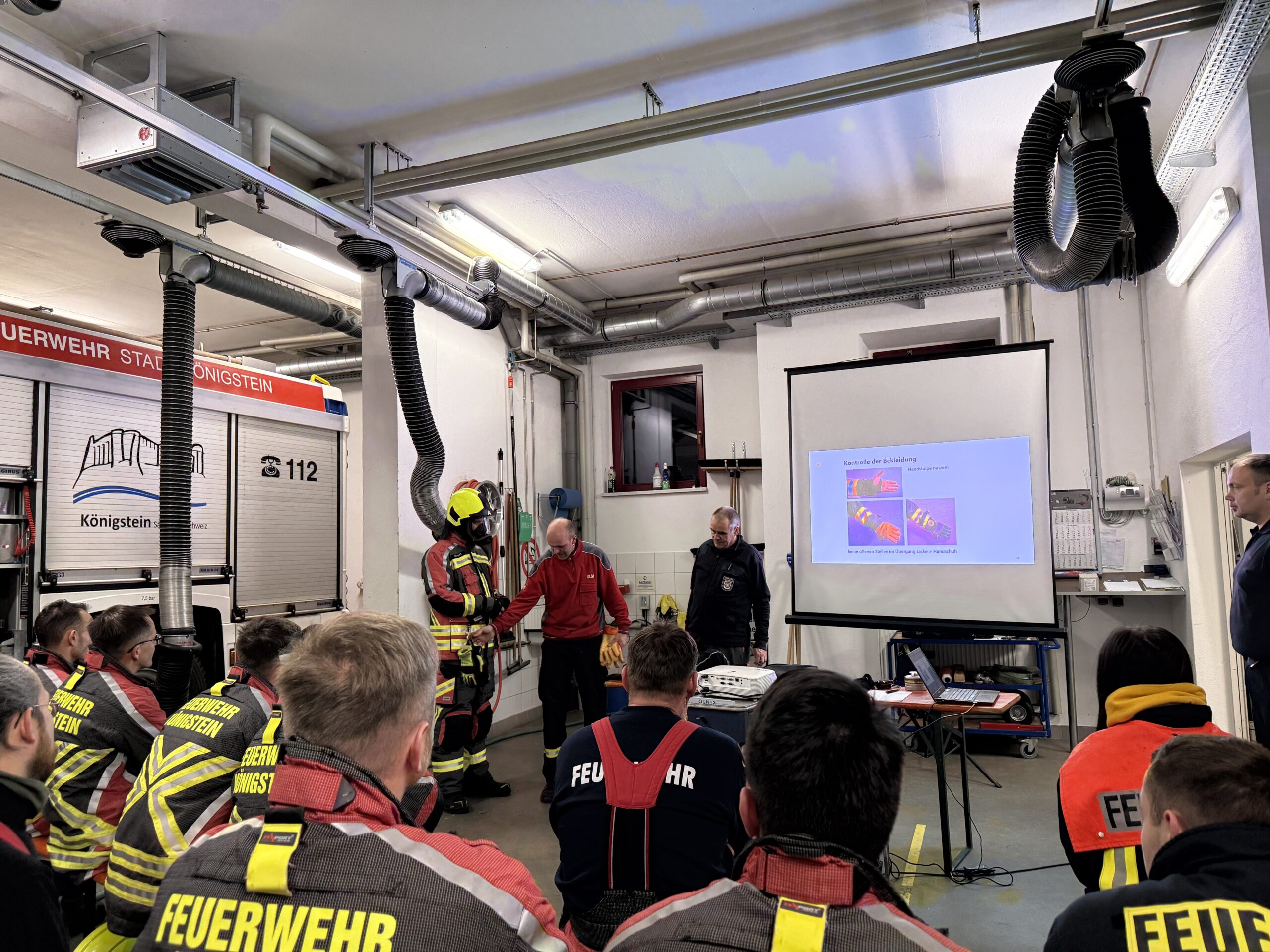 Beim Dienst am Dienstag fand die jährliche Atemschutzunterweisung nach FwDV 7 im Gerätehaus der OFW Königstein statt. Diese ist Pflicht für alle Atemschutzgeräteträger, aber auch wichtig für unsere anderen Kameraden, damit auch diese wissen, wie sie in verschiedenen Situationen die Geräteträger unterstützen können, beispielsweise beim Ausrüsten auf dem Fahrzeug.