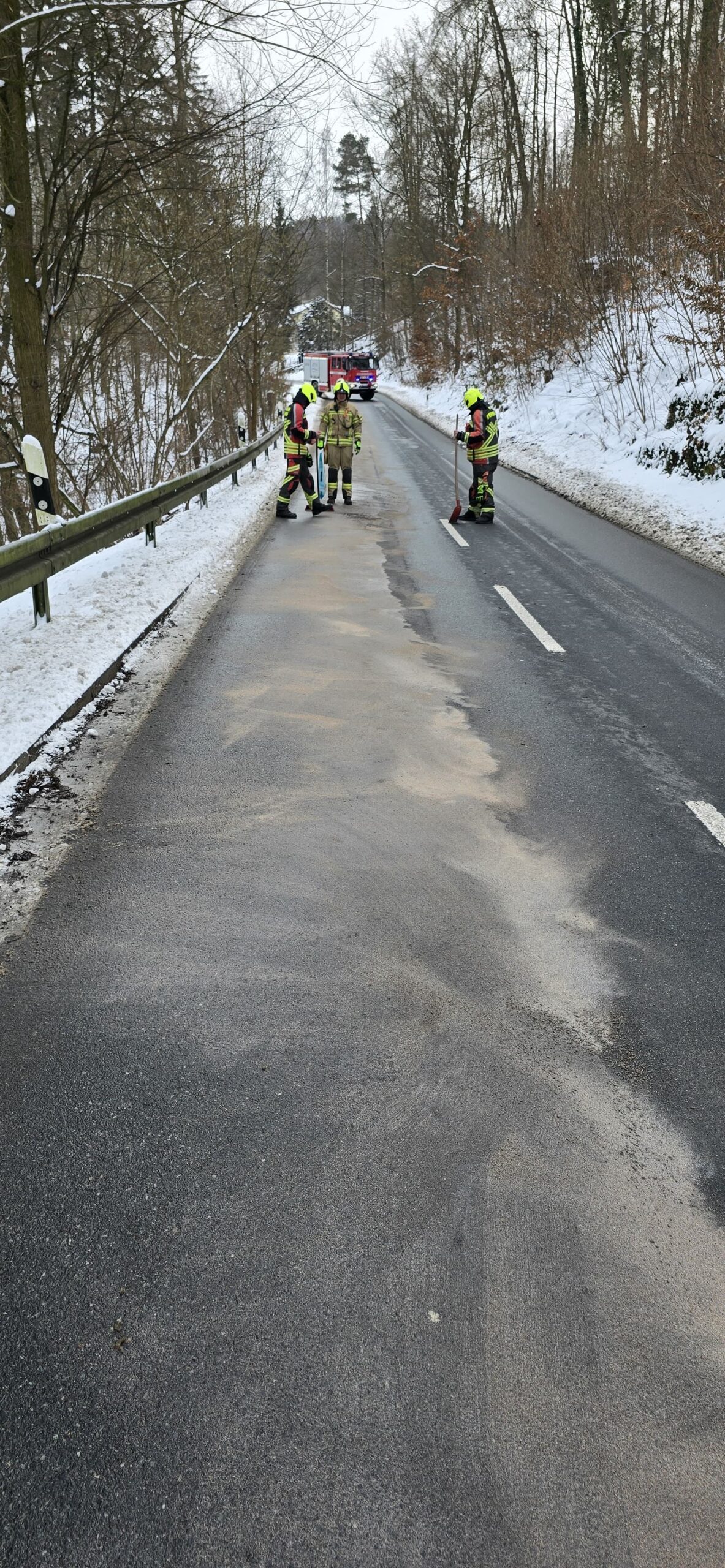 Zunächst wurden die Kameraden um 06:27 Uhr mit dem Stichwort „h-klein, PKW verliert Öl“ geweckt. Auf der S168 angekommen, bestätigte sich die Lage: Es mussten circa 50 Meter Ölspur mittels Ölbindemittel abgebunden und dieses anschließend eingekehrt werden. Ein Einsatz einer Ölspurbeseitigungsmaschine durch eine Fachfirma war aufgrund der zu niedrigen Außentemperaturen nicht möglich. Die Straßenmeisterei sicherte anschließend die Einsatzstelle mit Schildern.