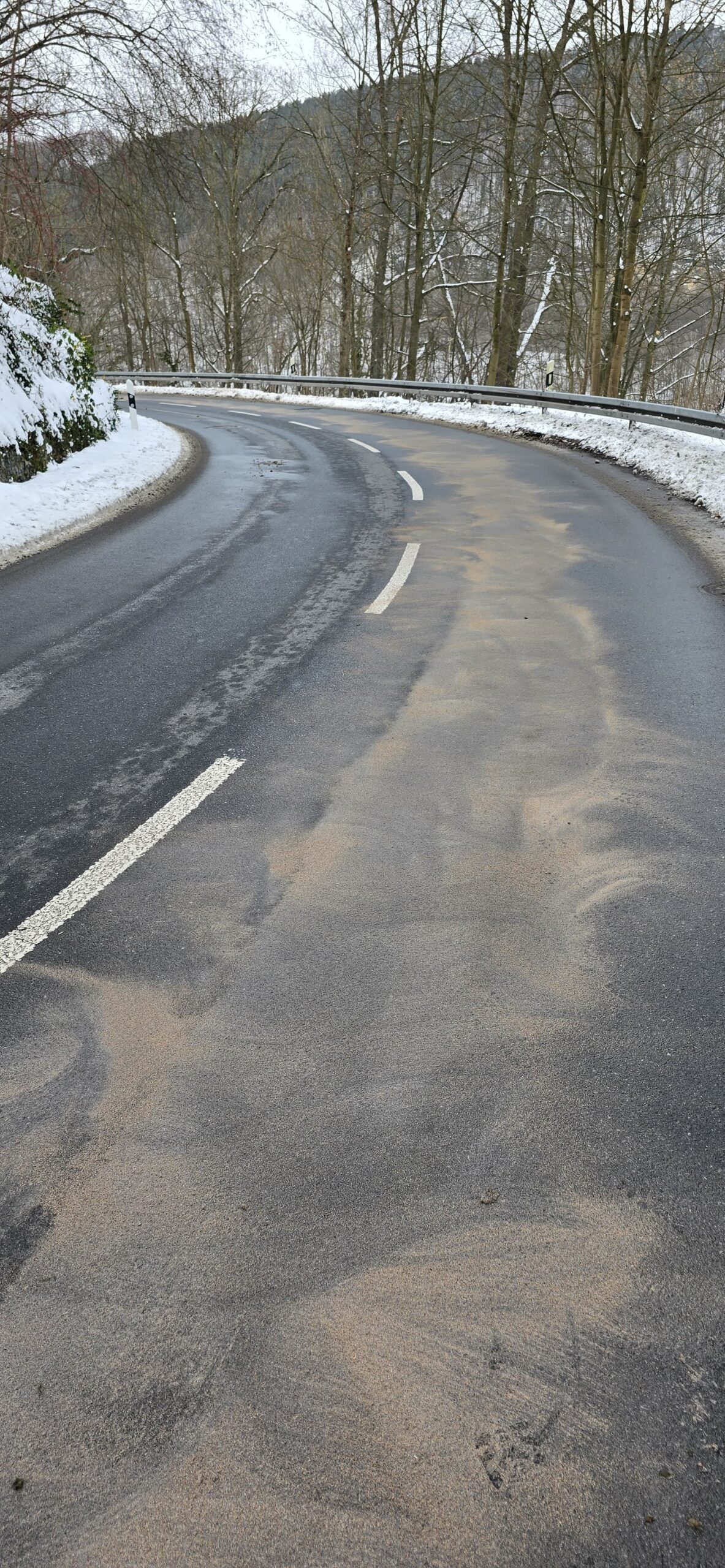 Wenige Stunden später hieß es wieder „h-klein, Ölspur“. Dieses Mal ging es auf die K8744 in Richtung Gohrisch. Die Kameraden fanden eine wesentlich längere Ölspur vor, welche auch dieses Mal händisch mit Ölbindemittel abgestumpft werden musste. Dieses wurde anschließend wieder aufgenommen. Bei diesem Einsatz unterstützte uns der Bauhof.